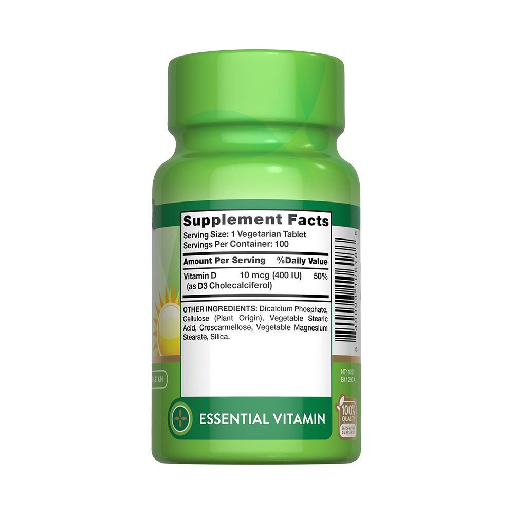 Nuestras tabletas de vitamina D3 le proporcionan 10 mcg (400 UI) de esta vitamina esencial por porción, lo que la convierte en una maravillosa adición a cualquier rutina de bienestar.